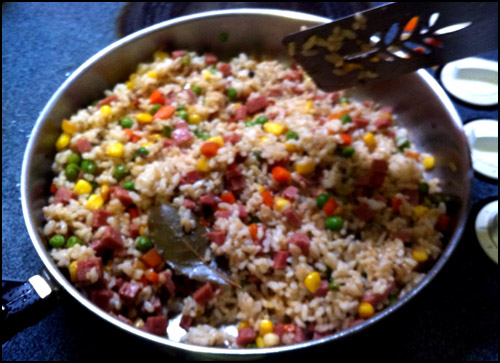 Next, after stir frying that around for a about 3-5 minutes, I put in my rice since that’s already cooked. I only need to brown the rice a little bit for another 5 minutes on medium heat.